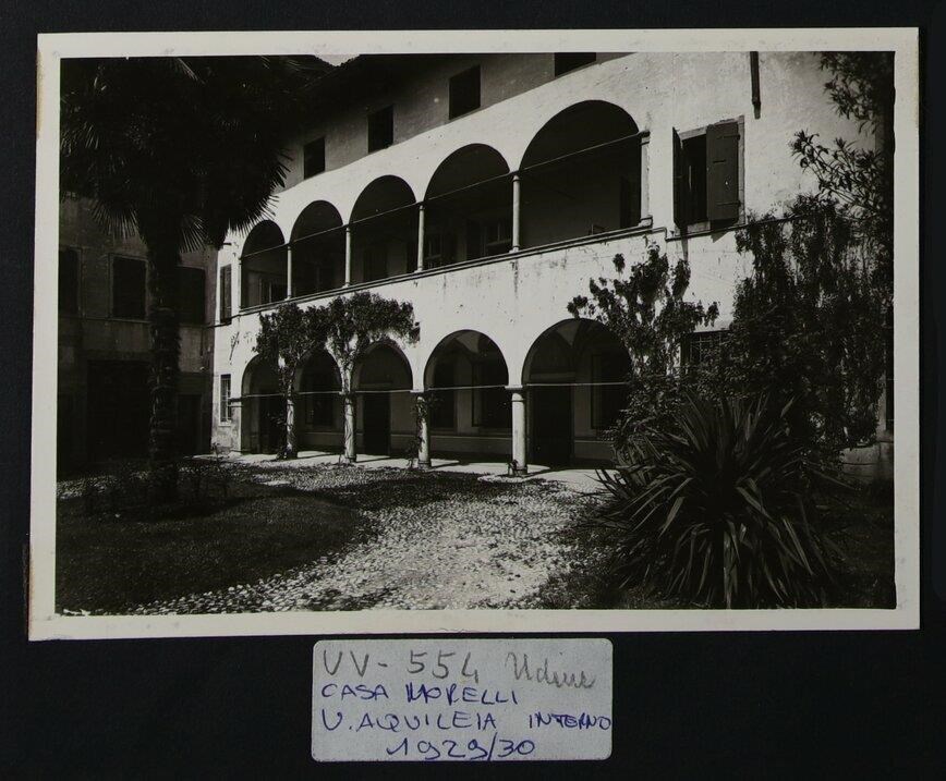 Udine, via Aquileia: loggia interna di Palazzo Morelli-de Rossi a due piani di origine cinquecentesca e di tipo rinascimentale. La struttura, dotata di archi a tutto sesto, ha subito degli interventi nel corso dell'Ottocento.