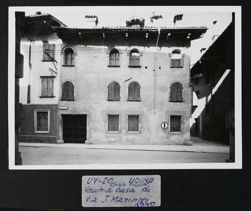 Udine, via Jacopo Marinoni: edificio realizzato in stile lombardo con finestre ad arco che accoglie la dimora del fotografo Luigi Pignat. A destra, in prospettiva, separata da un vicolo che portava alla "Braida Florio", Casa Mangilli, distrutta nel 1956 (successivamente venne costruito un condominio).
