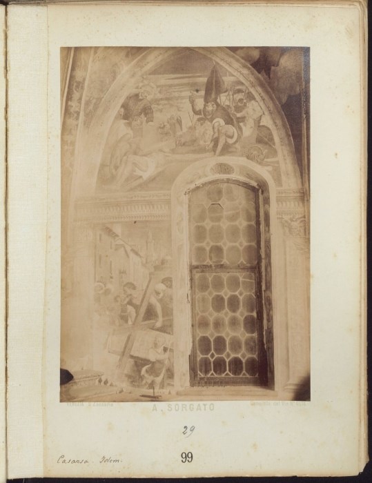 Affreschi di Pomponio Amalteo appartenenti al ciclo di "Storie della vera Croce", realizzati a partire dal 1536 nell'antica Chiesa parrocchiale di Santa Croce e Beata Vergine del Rosario di Casarsa della Delizia. Si tratta degli affreschi realizzati sulla parete di destra dell'abside: in basso è raffigurato "Il miracolo della Croce", nella scena in alto il "Cristo inchiodato alla croce". Nella didascalia sul supporto secondario dell'immagine, l'attribuzione degli affreschi viene fatta ad Antonio de’ Sacchis detto il Pordenone, maestro e suocero dell’Amalteo (la dicitura "idem" fa riferimento all'immagine precedente in album). Nel marzo del 1945 i bombardamenti alleati colpirono pesantemente l’edificio, distruggendo quasi del tutto la volta dell’abside e il lato sud dell’aula e compromettendo pesantemente gli affreschi.