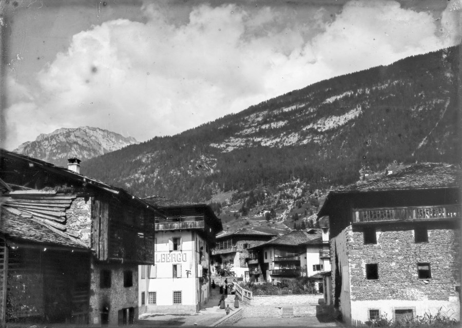 Veduta di un paese con le tipiche case carniche di montagna.