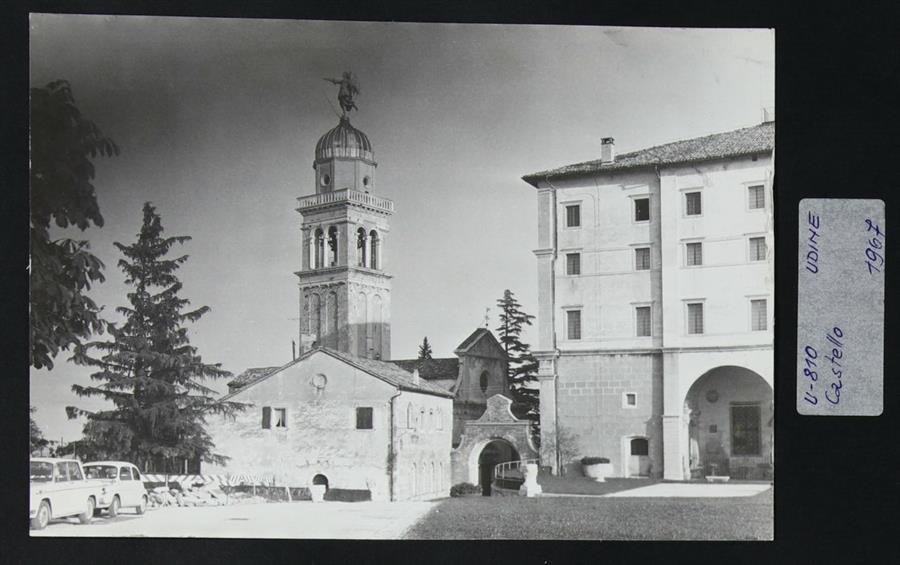 Udine: veduta del piazzale del Castello con il castello e, all'ingresso del piazzale, porta Nuova (arco Grimani), in pietra piasentina, con arco a tutto sesto rinascimentale e il Leone di San Marco. A sinistra, la Casa della Confraternita di S. Maria di Castello, edificio con archi in stile gotico sfuggito al terremoto del 1511. Sullo sfondo a sinistra, la chiesa di Santa Maria di Castello e il campanile cinquecentesco progettato da Gaspare Negro, con la scultura dorata e girevole rappresentante l'arcangelo Gabriele, in cima alla cupola emisferica portata a termine da Giovanni da Udine. In primo piano a sinistra, due automobili e nastro segnaletico.