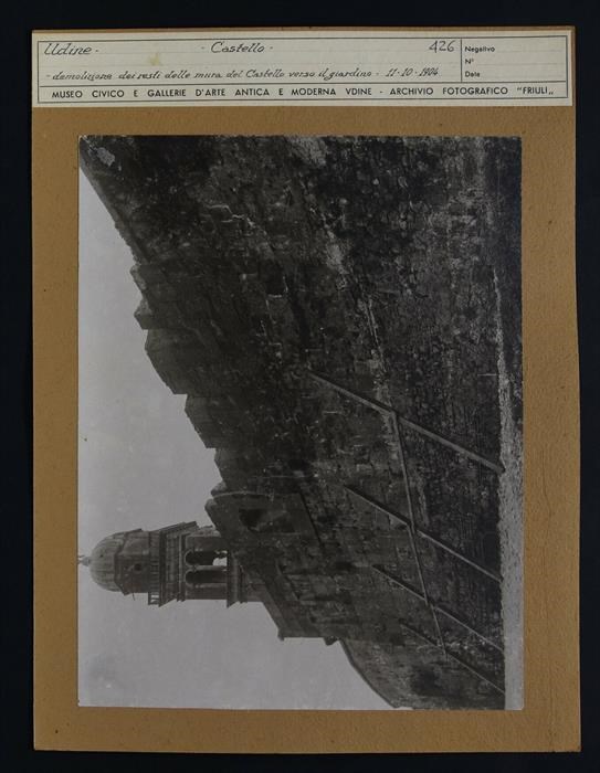 Udine, castello: veduta delle mura in fase di demolizione. A sinistra, in secondo piano, il campanile della chiesa di Santa Maria di Castello. In basso, tre panchine.