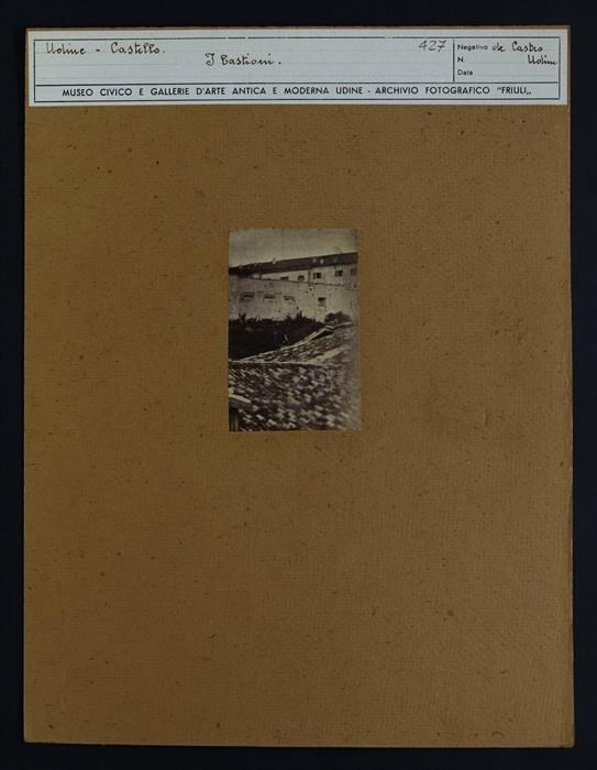 Udine, castello: veduta dei bastioni della cinta muraria. Nella parte inferiore, i tetti di alcune case.