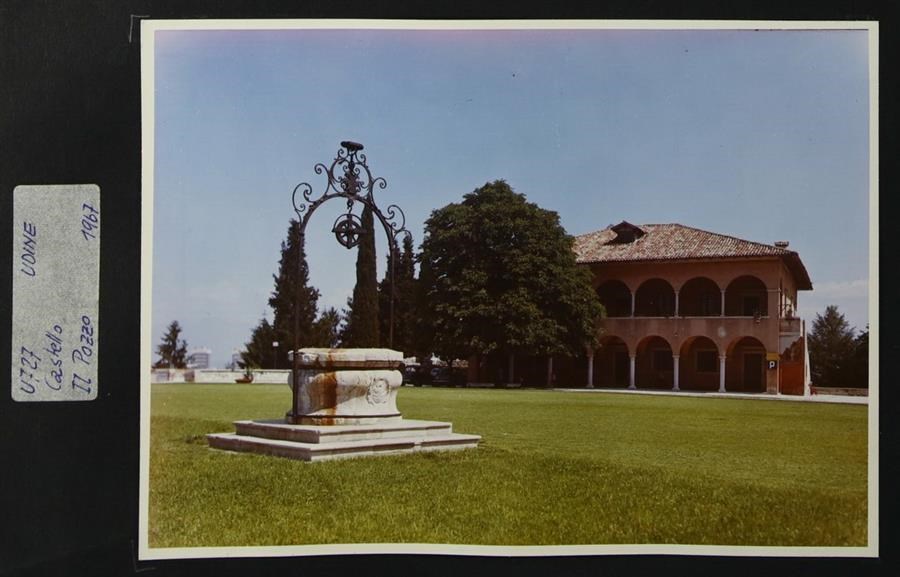 Udine, piazzale del Castello: la Casa della Contadinanza (diventata l'Armeria) risalente al 1931, quando si decise di erigere una copia dell'edificio cinquecentesco, sito in via Rauscedo, in cui viveva la rappresentanza dei contadini della Patria del Friuli. In primo piano a sinistra, il pozzo. Sullo sfondo, a sinistra, si intravedono due complessi condominiali della città.