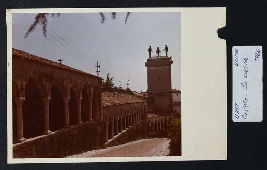 Udine: veduta della salita da piazza Libertà al castello. A partire da sinistra, il porticato ad elementi sfalsati, in stile tardogotico veneziano, voluto dal luogotenente Tommaso Lippomano (1486). In secondo piano, a destra, la Torre dell'Orologio, di Giovanni da Udine (1527), che si innesta sulla Loggia di San Giovanni. In cima alla Torre, i due Mori e, in mezzo a loro, una campana. Sullo sfondo a destra, la Loggia del Lionello, finita di costruire per volere di Nicolò Lionello.