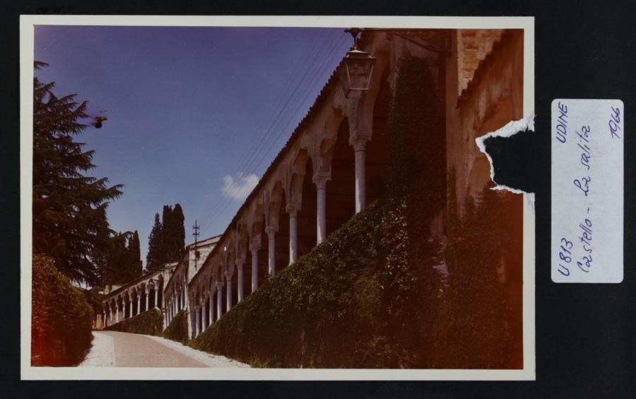 Udine: veduta della salita da piazza Libertà al castello. Da destra, il porticato ad elementi sfalsati, in stile tardogotico veneziano, voluto dal luogotenente Tommaso Lippomano (1486).