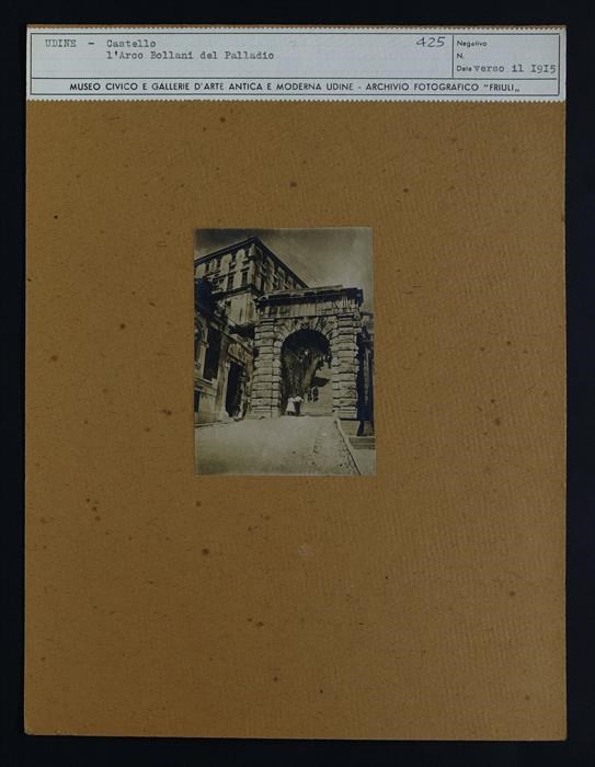 Udine, piazza Libertà: arco Bollani di Andrea Palladio (1556), costruito in bugnato per volere del luogotenente veneto Domenico Bollani. Cinque persone si incamminano verso il castello (due si trovano sotto l'arco). In secondo piano, a sinistra, il castello.