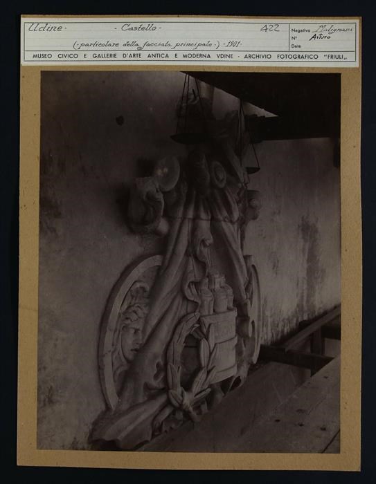 Udine, castello: particolare della facciata in rilievo con dei rotoli in una cesta sotto un tendaggio (dietro il quale si intravede un volto scolpito). Malignani è vissuto sul colle del castello, dove ha installato una stazione meteorologica.