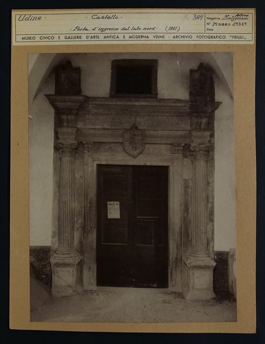 Udine, castello: portale del lato nord con due colonne corinzie e tre stemmi (uno al centro dell'architrave e due in alto a destra e a sinistra).