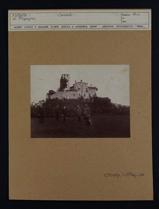 Fagagna, Villalta: veduta del castello medievale. Cinque uomini distinti (di cui uno con un ombrello in mano) sono presenti in primo piano.
