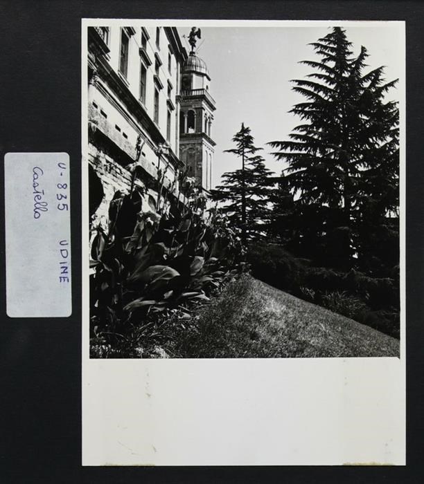 Udine: veduta del castello e del campanile cinquecentesco della chiesa di Santa Maria di Castello progettato da Gaspare Negro, con la scultura dorata e girevole rappresentante l'arcangelo Gabriele, in cima alla cupola emisferica portata a termine da Giovanni da Udine.