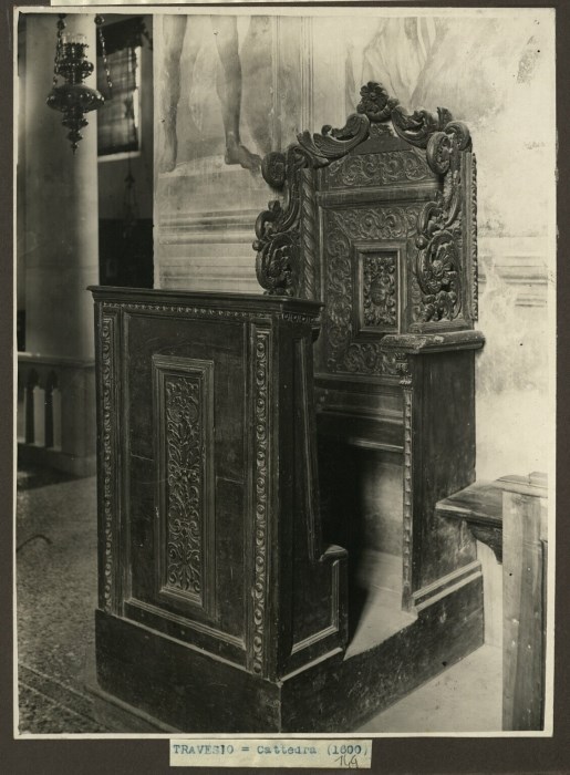 Riproduzione fotografica di una cattedra in legno intarsiato conservata presso Chiesa di San Pietro Apostolo di Travesio.