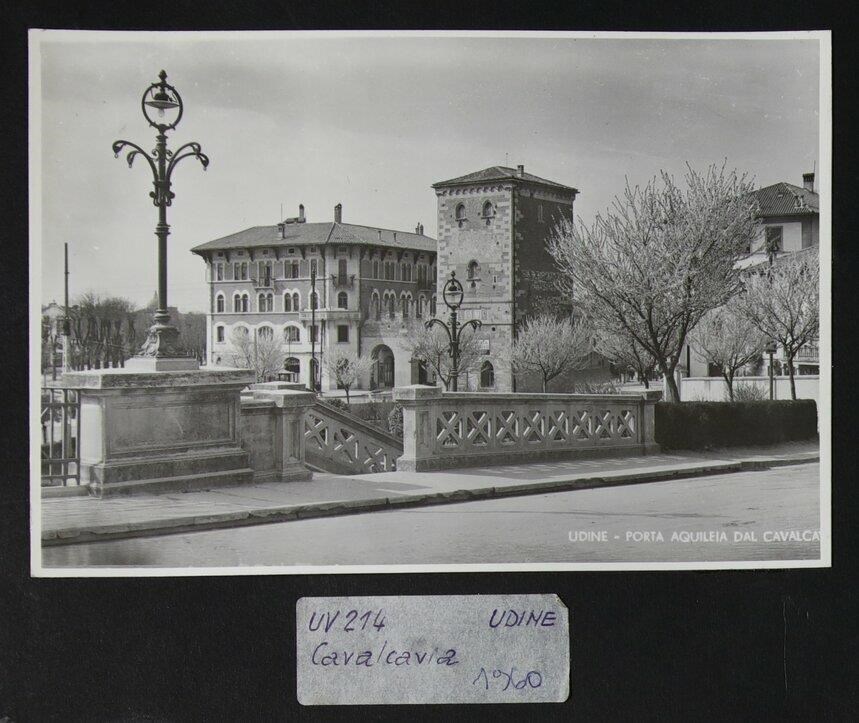 Udine, piazzetta del Pozzo: in secondo piano al centro, veduta di Porta Aquileia (metà del Trecento, quinta cerchia muraria) dal cavalcavia, iniziato a progettare nel 1896 ma costruito nel 1926 per favorire l'afflusso del traffico. In primo piano a sinistra, un lampione. In basso a destra è presente un'iscrizione a caratteri stampati che recita: "UDINE - PORTA AQUILEIA DAL CAVALCAVIA".