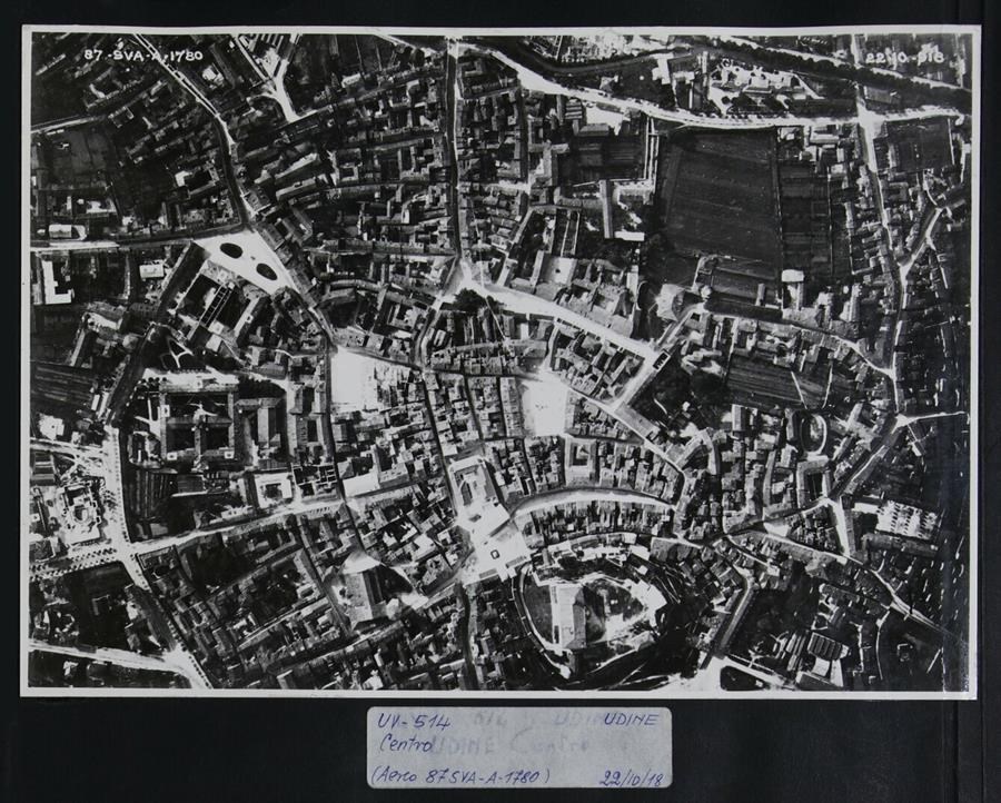 Udine: ripresa dall'alto dello scalo ferroviario. In alto a sinistra, l'iscrizione a mano "87 SVA - A - 1780". In alto a destra, un'altra iscrizione a mano "22 - 10 - 918". Lo scatto a scopo di ricognizione è stato realizzato verso la fine della prima guerra mondiale da un velivolo Ansaldo S.V.A.