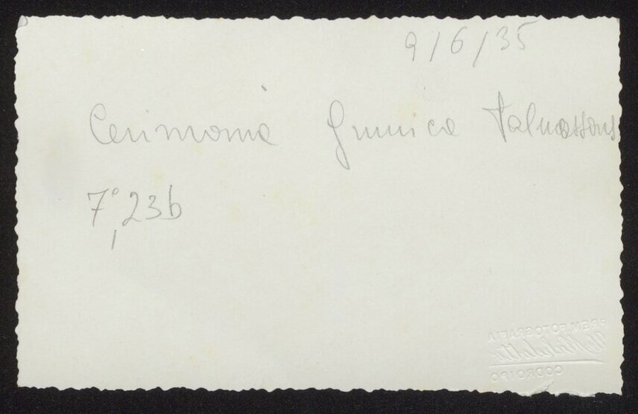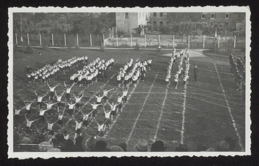 Gruppi di giovani Balilla e Piccole Italiane impegnati ad esibirsi durante una cerimonia ginnica a Talmassons, il 9 giugno 1935, nell'area scoperta della Casa del Balilla. L'immagine fa parte di un gruppo di 3 fotografie scattate nel corso dello stesso evento.