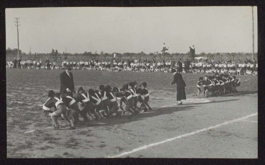 Due gruppi di giovani Balilla impegnati al tiro alla fune durante una cerimonia ginnica a Codroipo, il 9 giugno 1035. L'Opera nazionale Balilla per l'assistenza e per l'educazione fisica e morale della gioventù (nota come Opera nazionale Balilla, in sigla ONB) fu un'organizzazione giovanile del Regno d'Italia, istituita come ente morale durante il fascismo nel 1926, e sottoposta all'alta vigilanza del Capo del Governo alle dipendenze del Ministero dell'Educazione Nazionale. L'immagine fa parte di una serie di 7 fotografie dello stesso evento.