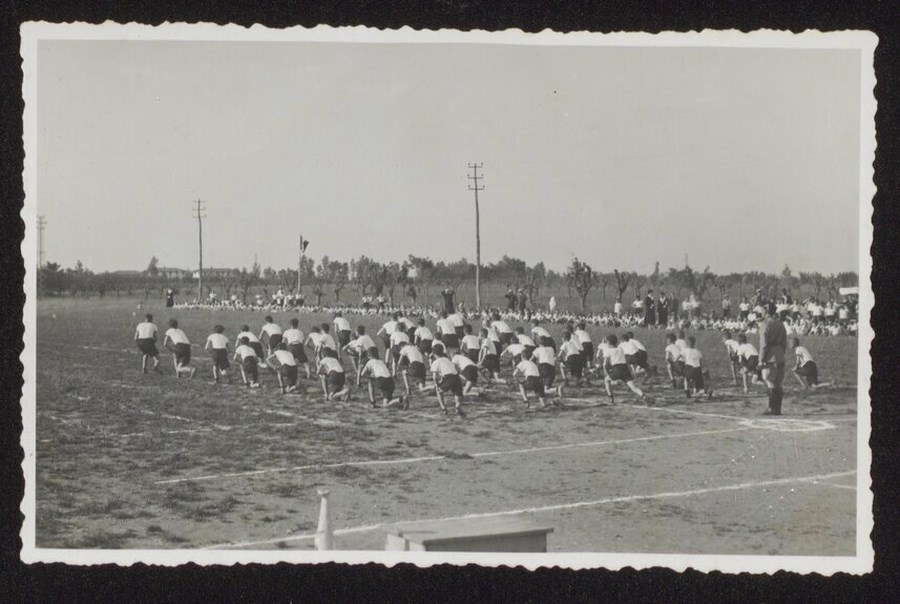 Giovani Balilla si esibiscono durante una cerimonia ginnica a Codroipo, il 9 giugno 1035. L'Opera nazionale Balilla per l'assistenza e per l'educazione fisica e morale della gioventù (nota come Opera nazionale Balilla, in sigla ONB) fu un'organizzazione giovanile del Regno d'Italia, istituita come ente morale durante il fascismo nel 1926, e sottoposta all'alta vigilanza del Capo del Governo alle dipendenze del Ministero dell'Educazione Nazionale. L'immagine fa parte di una serie di 7 fotografie dello stesso evento.