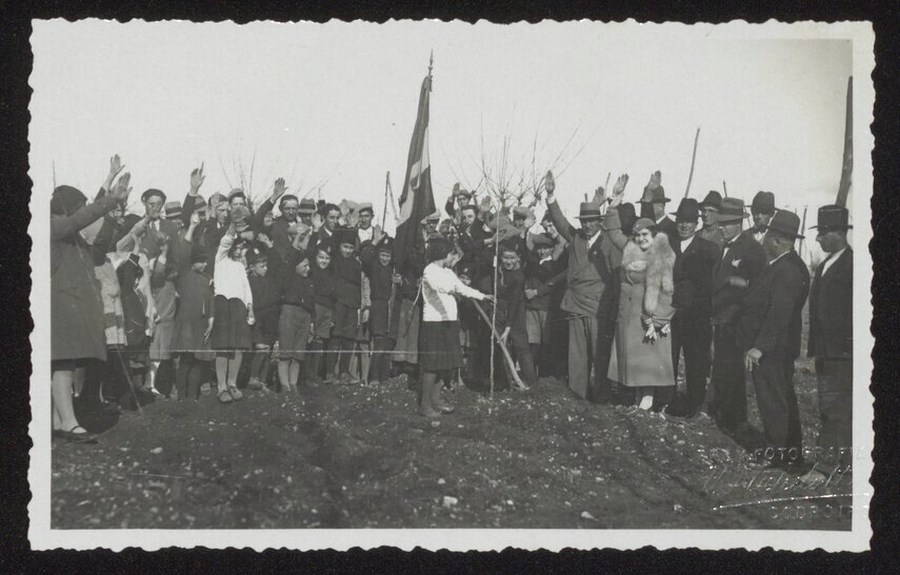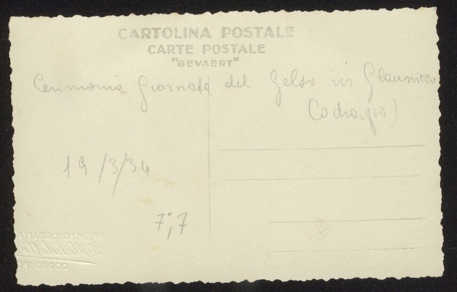 Una Piccola Italiana, circondata da numerose persone nell'atto di fare il saluto fascista, pianta un albero di gelso durante la cerimonia per la "Giornata del gelso", svoltasi a Glaunicco il 19 marzo 1934. La "Giornata del gelso", da celebrarsi ogni anni agli inizi della primavera, venne istituita dal fascismo che ne imponeva l'organizzazione all'Opera Nazionale Dopolavoro con l'obiettivo, in visione autarchica, di promuovere la bachicoltura. L'Ente Nazionale Serico forniva gratuitamente le piantine da porre a dimora.