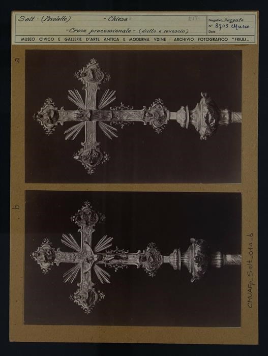 Povoletto, Salt: croce processionale in argento dorato costituita da parti che risalgono al XVIII secoli e a periodi precedenti, proveniente dalla vecchia chiesa di San Martino, demolita nel 1961 (verso).