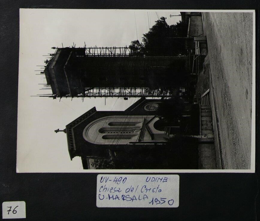 Udine, via Marsala: chiesa del Cristo, edificio religioso neoromanico costruito grazie al progetto dell'architetto Pietro Zanini (1926-1927). A sinistra, interventi per l'erezione del nuovo campanile (primi anni Cinquanta): nel 1954 venne celebrata la posa delle campane.