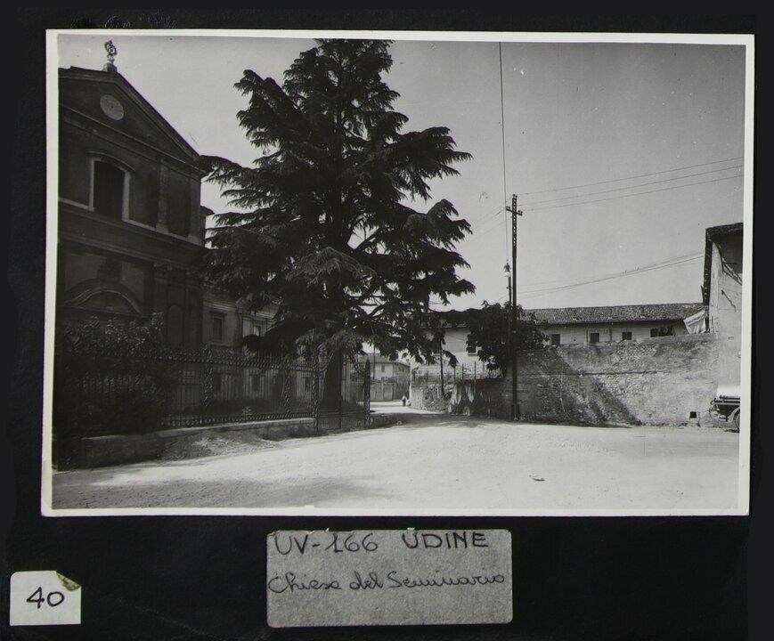 Udine, via Giuseppe Ellero (prima dell'apertura di viale Ungheria): la chiesa di San Bernardino da Siena (1522), oggetto di restauro e ampliamento sia nel Settecento, su progetto di Giorgio Massari - proponendo uno stile neoclassico - sia nel 1950, a seguito dei bombardamenti della seconda guerra mondiale. Sullo sfondo, al centro, un uomo.