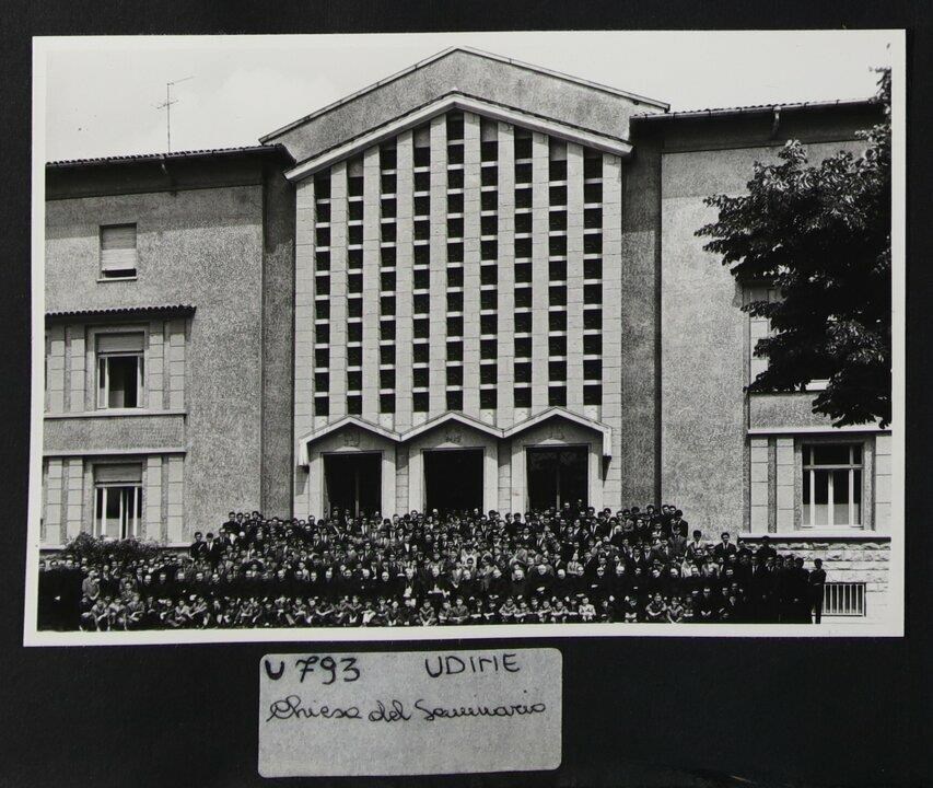 Udine, viale Ungheria: l'ingresso del Seminario arcivescovile di Udine "San Luigi Scrosoppi", inaugurato nel 1956, davanti al quale sono posizionati numerosi studenti e insegnanti. Si noti che viale Ungheria, essendo ancora in costruzione, stava prendendo forma a seguito dei bombardamenti della seconda guerra mondiale (anni Cinquanta e Sessanta); infatti diverse case vennero abbattute a favore di nuovi interventi.