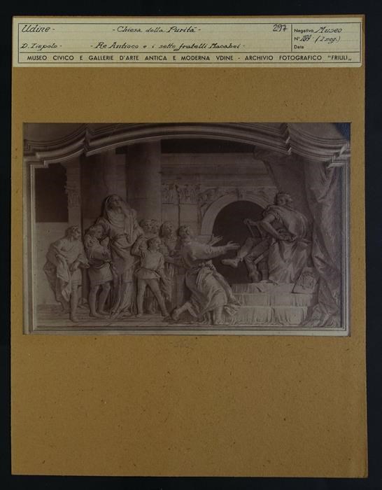 Udine, oratorio della Purità: "Sette fratelli Maccabei e la loro madre davanti al re Antioco", affresco parietale monocromo su fondo oro, entro una cornice mistilinea, di Gian Domenico Tiepolo (1759).