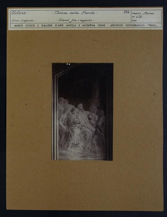 Udine, oratorio della Purità: Gesù benedicente i ragazzi, affresco parietale monocromo su fondo oro, entro una cornice mistilinea, di Gian Domenico Tiepolo (1759).