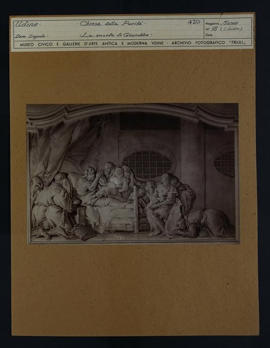 Udine, oratorio della Purità: Giacobbe morente benedice i dodici figli, affresco parietale monocromo su fondo oro, in cornice mistilinea, di Gian Domenico Tiepolo (1759). Giacobbe giace sul letto sotto un baldacchino, mentre i figli e i nipoti gli stanno accanto.