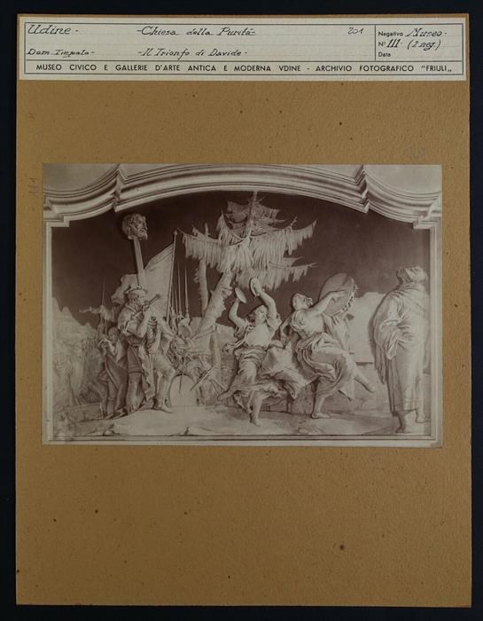 Udine, oratorio della Purità: "Il Trionfo di Davide", affresco parietale monocromo su fondo oro di Gian Domenico Tiepolo (1759). Si tratta del sesto riquadro a stucco degli otto realizzati dall'artista. In secondo piano i guerrieri e, a sinistra, Davide con in mano la spada su cui è collocata la testa di Golia.
