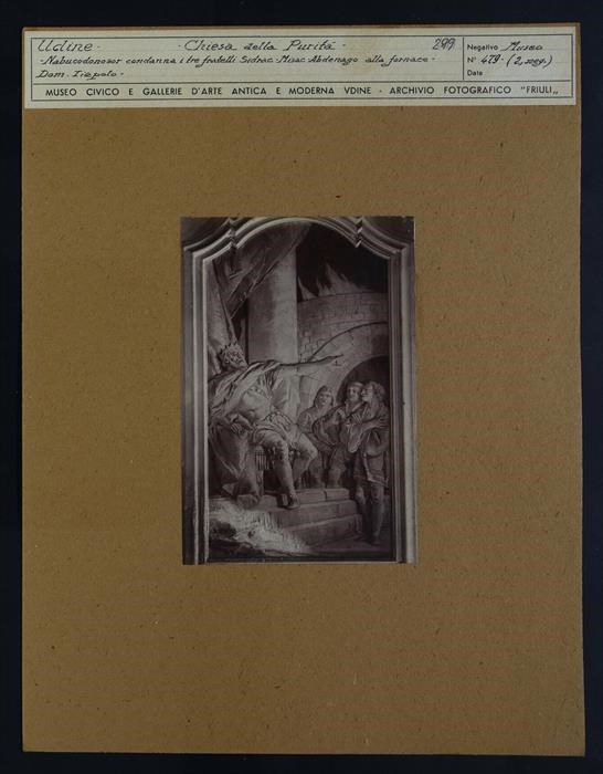 Udine, oratorio della Purità: Nabucodonosor condanna i tre fratelli Sidrac, Misac e Abdenago alla fornace. Affresco parietale monocromo su fondo oro, entro una cornice mistilinea, di Gian Domenico Tiepolo (1759). I tre ebrei babilonesi, a destra, vengono condannati dal re avendo rifiutato di adorare la statua dorata di Nabucodonosor. La storia è contenuta nel libro di Daniele (3, 1-97).
