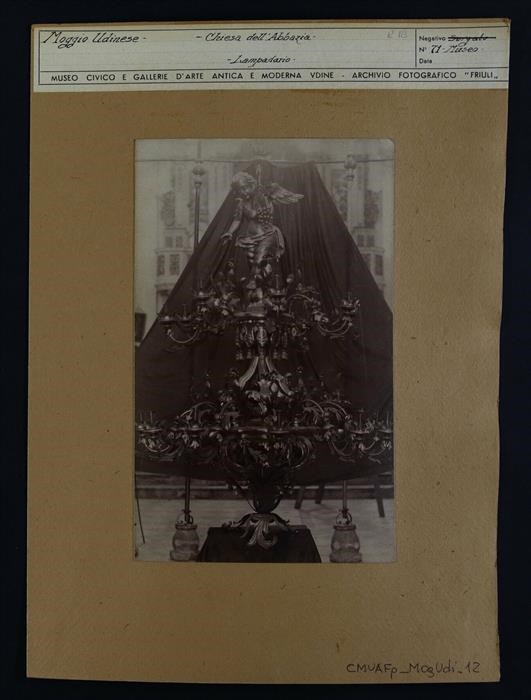 Moggio Udinese, abbazia di San Gallo: lampadario settecentesco in ferro battuto, legno intagliato e lamina d'oro. Sono presenti un putto, decorazioni fitomorfe, fregi e steli.