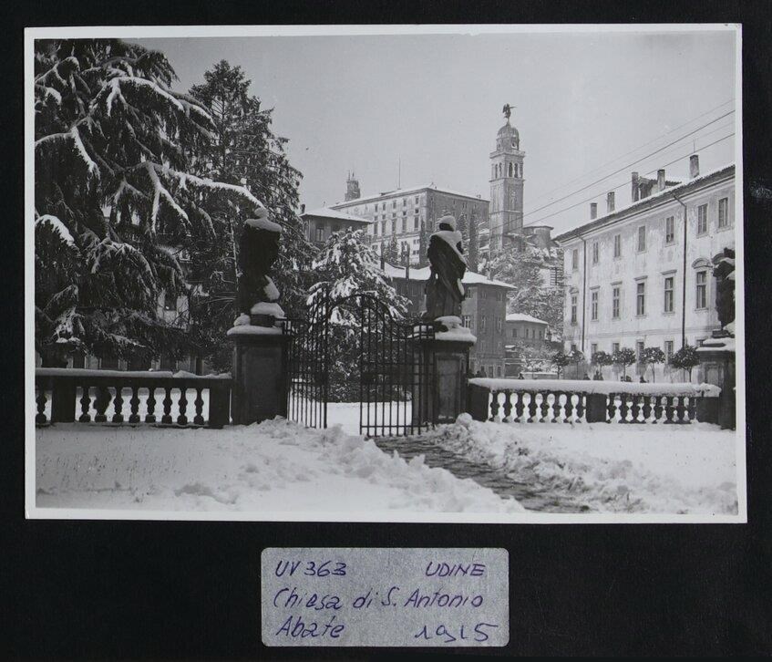 Udine: veduta di uno scorcio innevato di piazza Patriarcato. In primo piano, il cancello e tre statue appartenenti alla chiesa di Sant'Antonio Abate, con la facciata settecentesca di Giorgio Massari. Sullo sfondo, al centro, il castello e il campanile cinquecentesco della chiesa di Santa Maria di Castello, progettato da Gaspare Negro, con la scultura dorata e girevole rappresentante l'arcangelo Gabriele in cima alla cupola emisferica, portata a termine da Giovanni da Udine.
