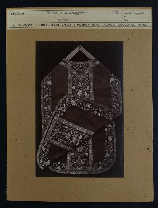 Udine, chiesa di San Cristoforo: pianeta ottocentesca (paramento liturgico), parte posteriore in cui sono presenti decorazioni floreali e vegetali ricamate in argento dorato. La pianeta è stata donata dalla contessa Teresa Dragoni Bartolini.