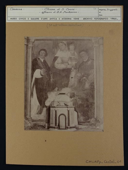 Casarsa della Delizia, chiesa parrocchiale di Santa Croce e Beata Vergine del Rosario: affresco cinquecentesco attribuito a Giovanni Antonio de' Sacchis, sull'abside, che rappresenta la Madonna con il Bambino, San Sebastiano, San Paolo e il donatore.
