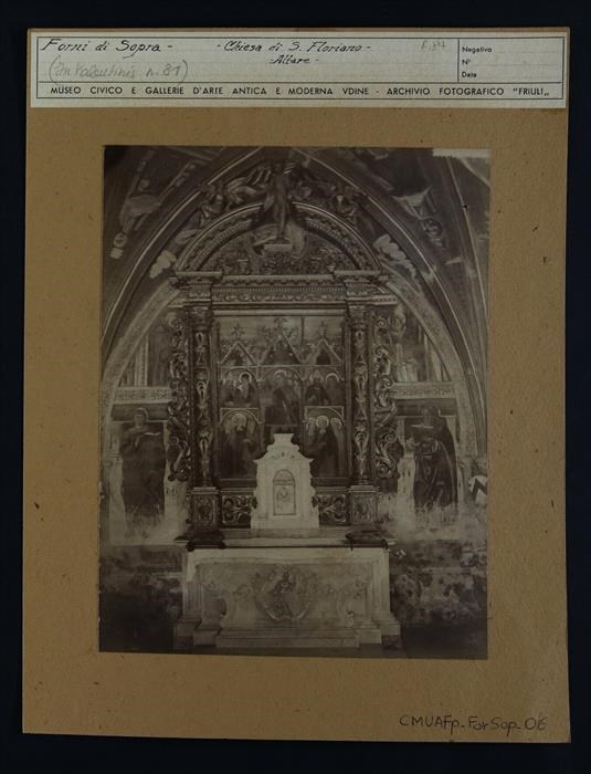 Forni di Sopra, Cella, chiesa di San Floriano: abside, altare ligneo e polittico con dipinti a olio su tavola di Andrea Bellunello (1480).