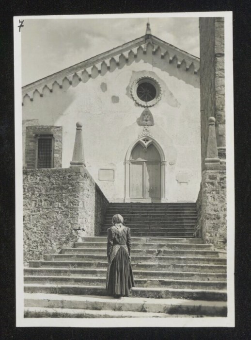 Lo scatto di Umberto Antonelli, farmacista e fotografo attivo in Carnia tra 1909 e 1949, è parte della serie di cartoline pubblicate dal fotografo editore Carlo Pignat con il titolo "Paesaggi e Costumi del Friuli" nella seconda metà degli anni Trenta del Novecento, raffiguranti tutte una Carnia e un Friuli arcadici. L'immagine ritrae una donna in abiti tradizionali friulani mentre sale la scalinata d'accesso alla Chiesa dei Santi Gervasio e Protasio (sec. XIV), a Nimis.