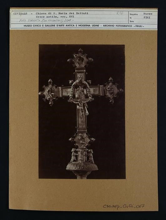 Cividale del Friuli, chiesa di Santa Maria dei Battuti: croce astile bronzea (ultimo decennio del Cinquecento). Al centro il Padre che sorregge la croce di Cristo Gesù, alla base del manufatto quattro putti e, alle estremità, gli imploranti.