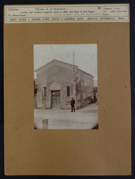 Udine, via Pracchiuso: veduta esterna della chiesetta di Sant'Antonio da Padova di origine trecentesca, prima degli interventi di restauro risalenti agli inizi del XX secolo affidati a Giovanni Del Puppo, quando viene ricostruita l'intera chiesa. Fatta costruire per volere dei conti Valentinis, che hanno intitolato l'oratorio a San Valentino, appartiene alla parrocchia del Santuario della Madonna delle Grazie. Agli inizi dell'Ottocento diventa oggetto delle soppressioni dipendenti dalle leggi napoleoniche e viene adibita a più usi profani (accogliendo anche un'osteria, un magazzino e un caffè). In basso, vicino all'ingresso, un uomo in divisa. Appoggiata al lato lungo, una scala in legno.