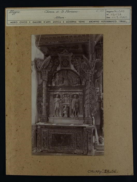 Tolmezzo, Illegio, chiesa di San Floriano: altare in pietra di Carlo da Carona con due colonne tortili, San Rocco, la Pietà, Giovanni Battista e, nella lunetta, la Madonna con Bambino (1510-1520). Sulla sommità, al centro, il Sacro Cuore dipinto, oggetto di contemplazione da parte di due angeli e dei due committenti (?).