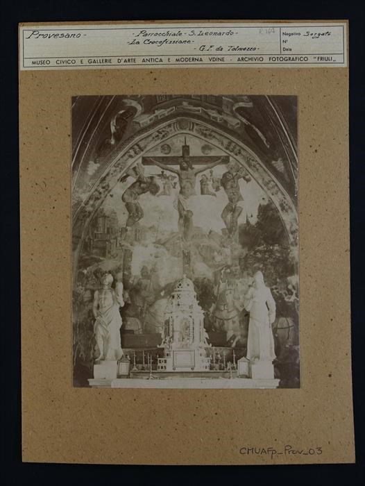 San Giorgio della Richinvelda, Provesano, chiesa parrocchiale di San Leonardo: affresco, sulla parete di fondo, della Crocifissione di Gianfrancesco da Tolmezzo (1496) e, davanti, due statue e l'altare al centro.