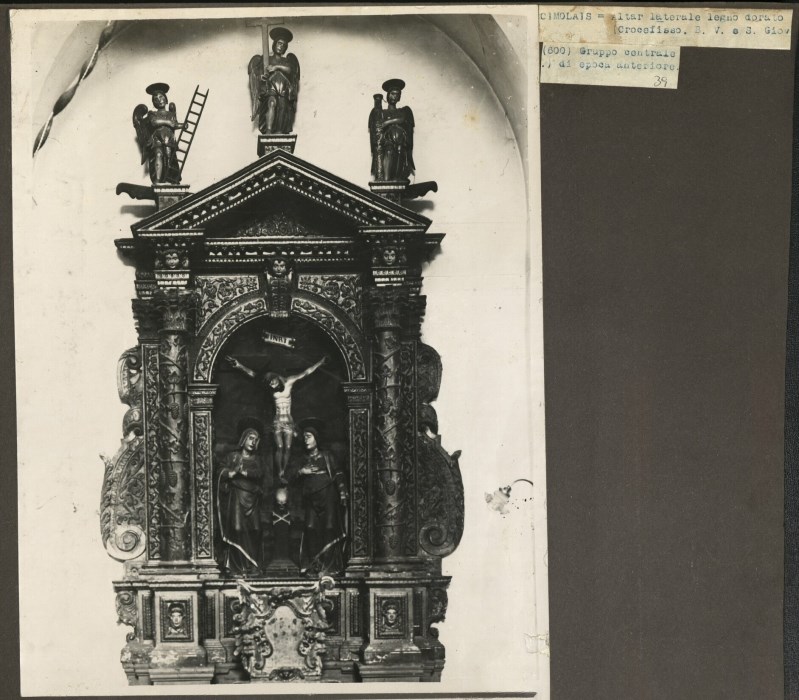 Cimolais. Altar laterale legno dorato. Crocefisso B. V. e S. Giov. ( 600 ). Gruppo centrale di epoca anteriore