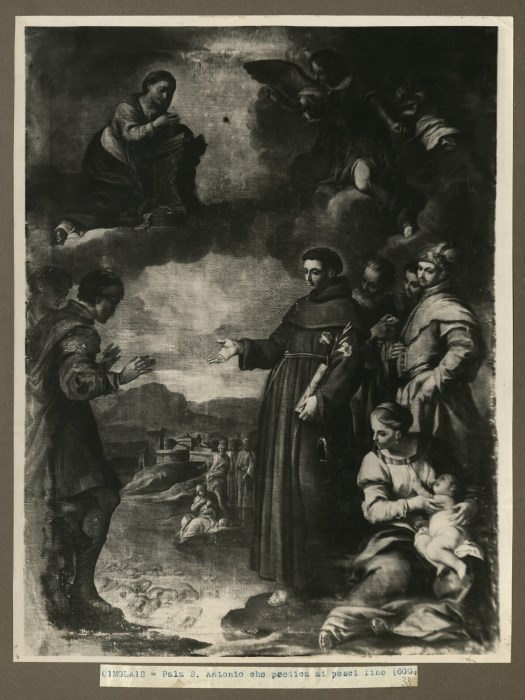 Pala raffigurante "Sant'Antonio mentre predica ai pesci" conservato presso la Chiesa di Santa Maria Maggiore a Cimolais; nell'opera raffigurata dei fedeli increduli dell'accaduto, una donna mentre allatta un bambino, in cielo fra le nuvole degli angeli ed una donna inginocchiata in preghiera. Sullo sfondo altri fedeli e la rappresentazione delle mura ed edifici di una città.