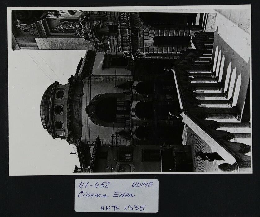 Udine: scorcio di piazza Libertà con, in primo piano a destra, la scalinata della Loggia del Lionello e il palazzo del Comune o Palazzo D'Aronco (1911-1930) e, in secondo piano al centro, il cinema Eden in stile liberty, costruito su progetto dell'architetto Provino Valle (1921) e demolito nel 1958.