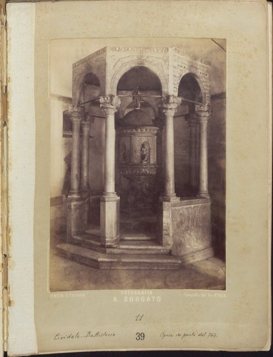 Il Battistero di Callisto, ovvero il fonte battesimale del patriarca Callisto, a Cividale, risalente al periodo della cosiddetta Rinascenza Liutprandea (730-740), della quale rappresenta un capolavoro. Il battistero è alto 3,54 m ed è realizzato in calcare bianco; è formato da un ottagono con sette archetti, sorretti da colonne che insistono su una balaustra nella quale sono inseriti frammenti di plutei marmorei di epoca alto medioevale. In cima a ogni colonna i capitelli sono formati da foglie d’acanto; la decorazione degli archetti, composta da tralci di vite e da animali scolpiti, è ispirata al mondo orientale. Più in alto corre un’iscrizione dedicatoria che testimonia l’epoca di costruzione degli archetti, intorno al 737-756. A destra nell'immagine, si vede il cosiddetto pluteo di Sigualdo, con i quattro simboli degli evangelisti all’interno di tondi angolari, una croce latina e decorazioni a rosette, palme, candelabri (in alto), un albero della vita, colombe e grifi (in basso).