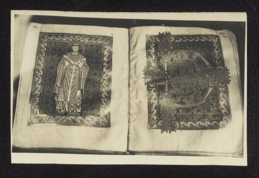 Riproduzione fotografica di cc. 99v e 100r del manoscritto noto come Salterio di Egberto (Codex Gertrudianus), oggi conservato presso l'Archivio e Biblioteca del Museo Archeologico Nazionale di Cividale del Friuli. Prodotto a Reichenau e arricchito successivamente nella Rus’ di Kiev, arrivò in Friuli grazie al patriarca Bertoldo di Andechs. Il Salterio venne offerto dal monaco Ruodprecht all’arcivescovo Egberto di Treviri (977-993), come mostrano i versi e la scena di dedica all’inizio del manoscritto. Nell’XI secolo passò alla principessa polacca Gertrude, moglie di Iziaslav I, gran principe di Kiev (1054-1078), e madre di Jaropolk, principe di Kiev (morto nel 1086). Successivamente arrivò nel monastero di Zwiefalten, come si ricava dalle integrazioni al calendario. Attraverso la famiglia Andechs-Merania il Salterio arrivò quindi al patriarca di Aquileia Bertoldo (1218-1251), zio di santa Elisabetta d’Ungheria, che secondo la tradizione lo avrebbe donato al capitolo di Cividale.