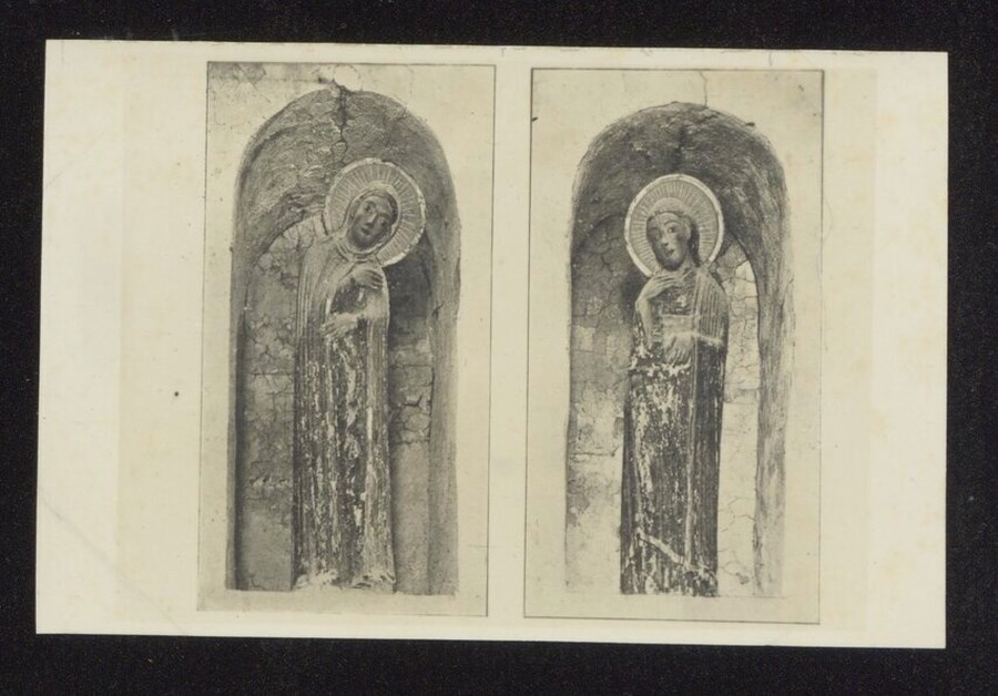 Lacerti di affreschi staccati, d'epoca tardo medievale, raffiguranti due santi, conservati nel Tesoro del Duomo di Cividale.