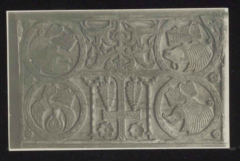 Riproduzione fotografica del cosiddetto Paliotto di Sigvaldo, corrispondente ad una delle due facce scolpite (entrambe materiali di riutilizzo) del parapetto del battistero di Callisto nel Duomo di Cividale del Friuli. Il paliotto, datato alla seconda metà dell'VIII secolo, era in origine probabilmente la parte anteriore di un altare. Nelle quattro zone d'angolo sono raffigurati i simboli degli Evangelisti reggenti tavolette su cui sono incisi i versi latini del poeta Celio Sedulio (V sec.); nella parte centrale superiore è scolpita una croce, contornata da candelabri, rosette e due alberi coniformi, mentre nel quadrante centrale inferiore è raffigurato un albero stilizzato. Tra i due quadranti centrali è scolpita la scritta HOC TIBI RESTITVIT SIGVALD BAPTESTA JOHANNES.