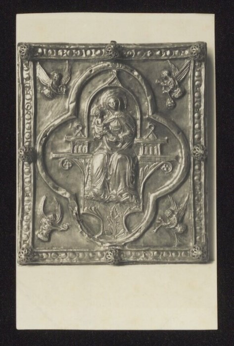 Coperta di Evangeliario con Madonna con Bambino, in argento dorato, databile alla seconda metà del XIV secolo, appartenente al Tesoro del Duomo di Cividale. Entro una cornice rettangolare quattro angeli osannanti con turiboli sono posti ai lati di una mandorla quadrilobata comprendente la figura della Vergine con Bambino seduta su un trono sagomato ad archetti nei braccioli e rivestito dalla parte inferiore di fogliami.