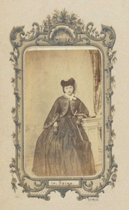 Ritratto, in studio, della Contessa Gorgo in abito scuro e con ombrellino parasole in mano